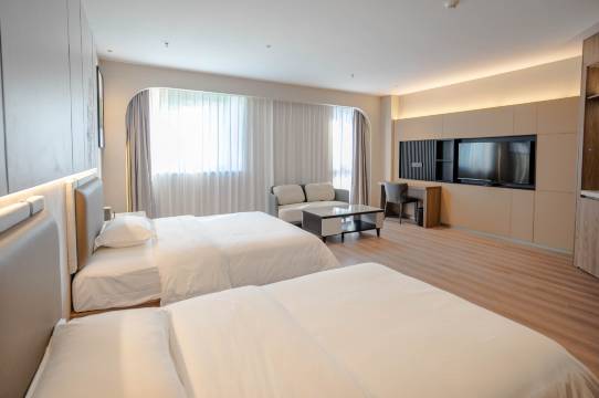 酒店就在高速旁边,高速下来后很快就到,设施很新,亲子房空间很大,洗漱用品也很好用,总体非常满意。房间里希望在两个床之间加一个床头柜,照顾孩子需要放些东西比较方便。另外就是早餐的选择可以适当再增加一些。