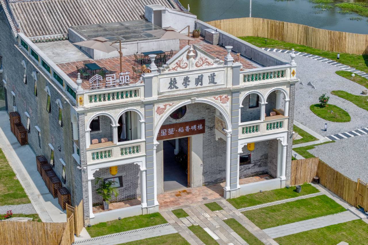 民宿选址于开平地区独特的中西合璧建筑群——碉楼,该碉楼名为“道明楼”,建于民国十三年(1924年),采用典型的“前祠后楼”宗族祠堂学校建筑模式,是一座集碉楼(道明楼)、学校(道明学校)、公祠(自愚周公祠)三位一体的宏伟壮丽、新颖独特的中西合璧建筑群,是开平地区首座碉楼民宿。