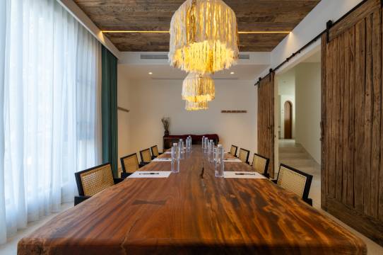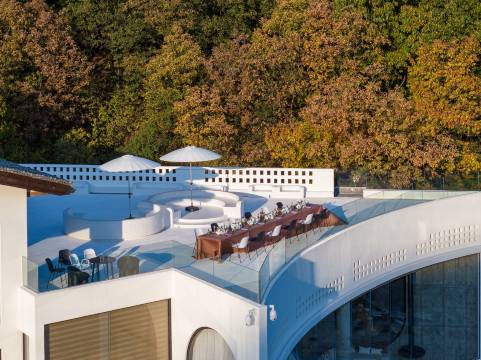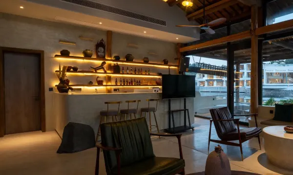 民宿位于浙江省东阳横店镇三湖口村,毗邻中国横店影视城各大景区及高铁站、机场,民宿虽隐于山间但并不与城市隔绝,至市区与横店各大景区车程都在15分钟内,依山傍水,风景极佳,闹中取静。百余亩的独立山坞里面建了五栋建筑,装修品质高端有格调同时追求环保侘寂融于自然。所有房间都带有独立超大露台,配置了中央空调地暖新风系统,真火壁炉,无边泳池,私人温度泡池及独立温泉大泡池,桑拿房,下沉篝火区内配置了双门户烤面包炉,户外烧烤区,四五千方的精修大草坪可做团建、婚庆和露营基地,有垂钓水库菜地等户外活动空间,推门便可见青山绿水。民宿具备完整的乡村度假生态系统,集客房、餐厅、咖啡馆、棋牌,茶室,KTV,酒吧,杂货铺,配有精英会议室及容纳百余人带舞台多功能厅等等一应俱全,客房内配置金可儿床垫科勒卫浴,戴森吹风机,B&O落地音响及马歇尔音响,斯麦格烧水壶,锐步跑步机等尖端软装项目。