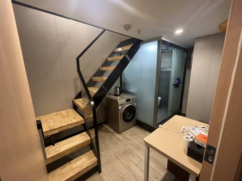 酒店是小跃层。楼上睡觉楼下厕所和沙发。优点在于有洗衣机。有的房间有厨房。适合长期居住。不用和人合租。 不好的地方是上下楼梯有些不方便。屋内卫生有待加强。管理员很热心。好评。