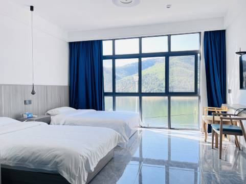 这家民宿位于湖边,地理位置绝佳。当我推开窗户,那波光粼粼的湖面和远处连绵起伏的山峦瞬间映入眼帘,仿佛一幅绝美的山水画卷在我面前徐徐展开。清晨,第一缕阳光洒在湖面上,泛起金色的涟漪,让人陶醉不已。夜晚,伴着轻柔的湖风,我在宁静的氛围中安然入睡,仿佛置身于一个与世隔绝的仙境。