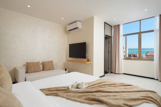 旺季来的,酒店机票都超级贵。带娃,选择离海边近的,千挑万选,被差评劝退了很多家,最后选的这个。晚上到达,看到这么小的门脸有点失望,因为图片很大。但进来之后发现房间很宽敞,还有浴缸。尤其是没有最担心的卫生问题,房间很干净挺新的,没有卫生死角,没有霉点没有潮气。卫生间和卧室都有窗户,虽然临街,但是很有烟火气,晚上睡的也挺香。早晨听到了久违的公鸡叫声。前台小姐姐也很好,临时加的被子、水都亲自送上来。各种回复很及时。离海边近,溜达无压力,注意交通安全即可。好评。