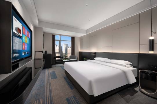 客房空间宽敞,全景落地窗可俯瞰城市天际线,床品为高端品牌定制,躺卧舒适度满分。智能控制系统能一键调节灯光、窗帘与空调,迷你吧饮品丰富且免费供应。卫浴干湿分离,配备大牌洗护用品,浴缸泡澡体验极佳。