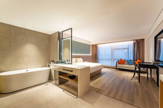 这个酒店我是随机定的里面的设施都很新,外卖也是机器人送的方便,酒店也配备接送机服务提前预约就可以哦,总体来说非常不错的。