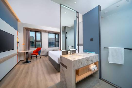 房间:干净整洁 办理入住的时候提了一下不想要靠近高架的,前台主动给我升级了高楼层的房间视野更好房间也很舒适!