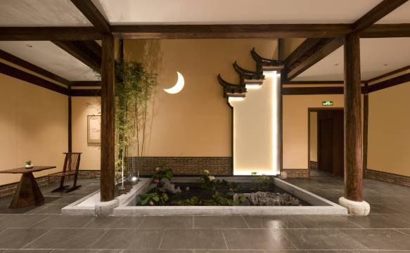 民宿占地750平米,共拥有十间客房。为保证居住舒适性,所有区域均配套有空调和地暖设备。同时,在不大的面积中融入了多处景观,做到屋中看景、景融于屋,让住客所处老宅中能亲身体会徽州文化的美感和魅力。