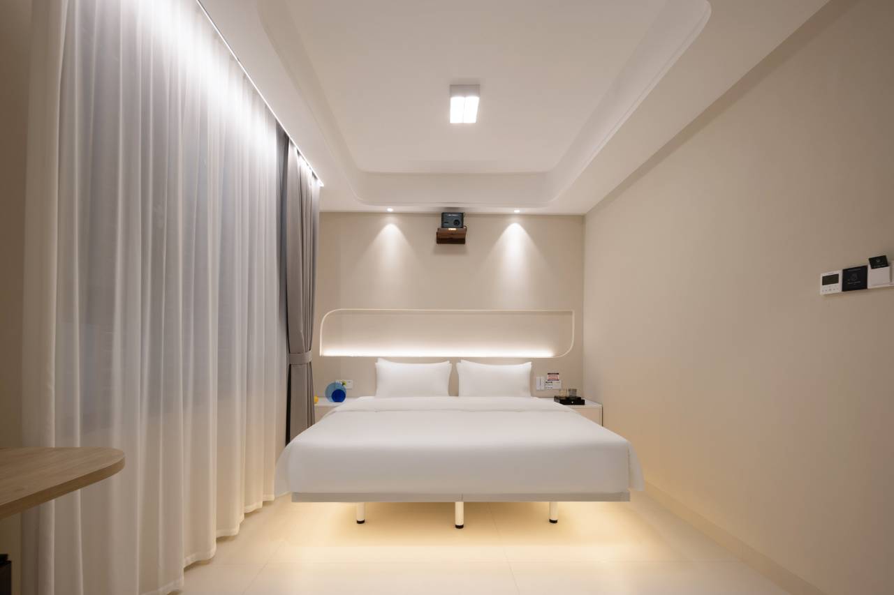 • 灯光设计柔和不刺眼,床头的氛围灯和顶部的嵌入式灯带,让整个空间温馨又有格调。