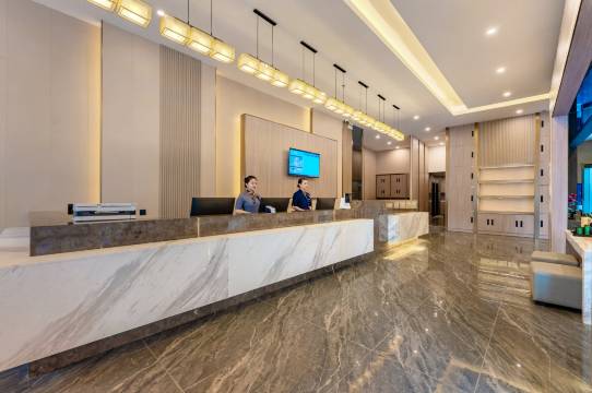 大堂装修很豪华哦,环境温馨,设施方面配套全面,停车位充足,不用担心晚上回来车子没处停放!卫生做得很到位,干净整洁,客房大姐笑脸相迎,前台小姐姐服务态度也是非常热情专业!出差或家庭出行都可以选择的酒店[强]