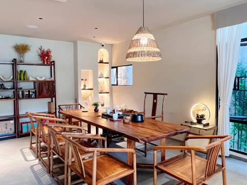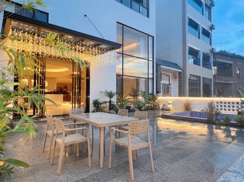 这是一座独栋带院子的温泉民宿,一楼打造成多功能厅和休闲茶区,让你可以尽情开会、聚餐、聊天、游戏,享受美好时光的同时还能欣赏到室外美景!