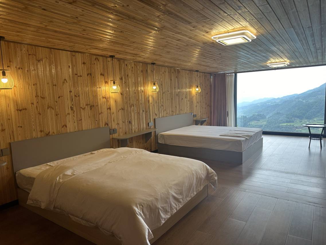 房间又宽又舒服面对窗外是落地玻璃窗一眼望去有一幅自然美丽常景。傍晚在窗前看美丽落日,早上起打开窗帘来见到美丽富饶的云海。房间也很整洁,老板也很的热情,服务也很周到,我明恋这里的环境舍得离开,下次我还会来。