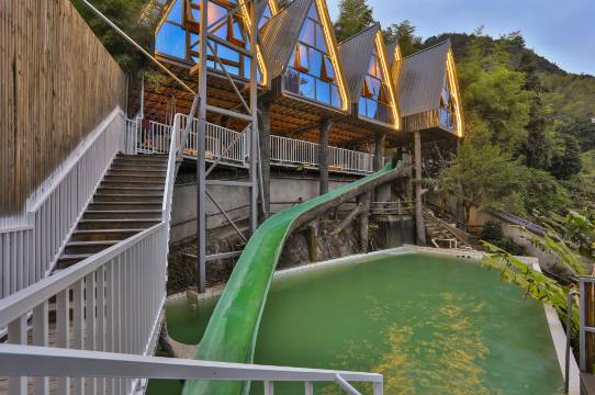 竹屋民宿很有特色,小朋友在泳池滑梯玩得很开心,推荐。边上就有一天小溪,白天可以在小溪里补补鱼,玩玩水