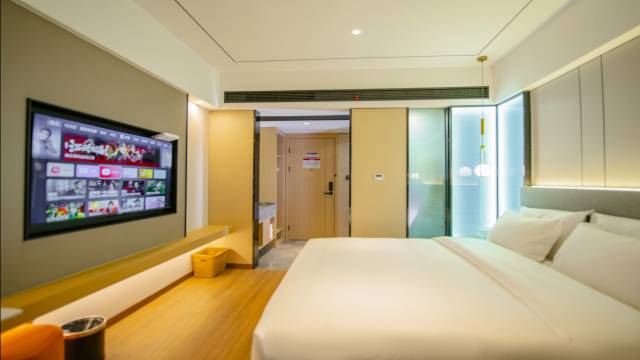 房间干净整洁,宽敞明亮,设施齐全,小度智能特别方便,地理位置好找关键是停车方便,前台女生服务热情,天气太热了,还给我们送了冰饮,升级了房间,国庆期间没有涨房价,性价比超高,非常感谢!,