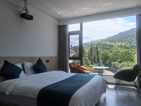 民宿装修现代简约木作风格,客房配置中央空调、智能马桶、空气能热水器、投影仪。民宿地理位置优越,门口方便停车。