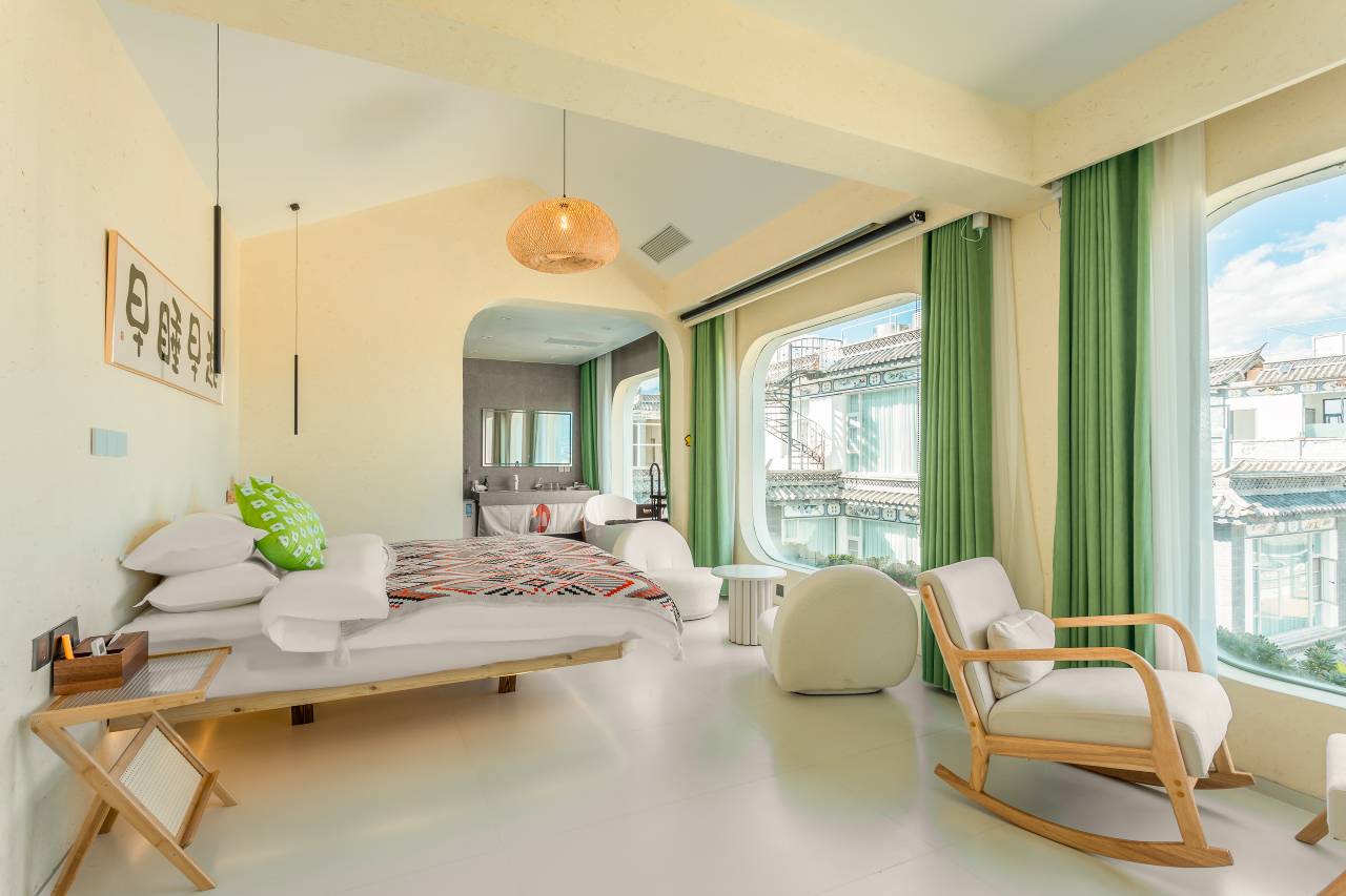 入住前筛选了很多酒店,最后主要被房间窗户的设计和住宿环境吸引。到达民宿前,老板开着小三轮来接我们,非常贴心的给我们很多出行的攻略。房间里面设施超乎想象的齐全,有浴缸🛁、小米洗衣机、智能马桶、小米空调、小米吹风机,就连毛巾浴巾都是一次性的,桌面上还有梳妆镜等等应有尽有。窗帘是智能的窗帘,三面都有窗户的阳光房,打开窗帘景色非常漂亮,看到日出和洱海,关键关键特别安静,真的非常非常的意外,所以当即决定再多住一晚上。在大理的几天在出行中非常开心,每天早上都可以推开窗就能看到日出,在房顶上看到的日出也太美了。骑行几公里到网红海边看日出的地方也非常方便。我真的非常非常喜欢这里,强烈推荐,以后有机会一定还会再来。