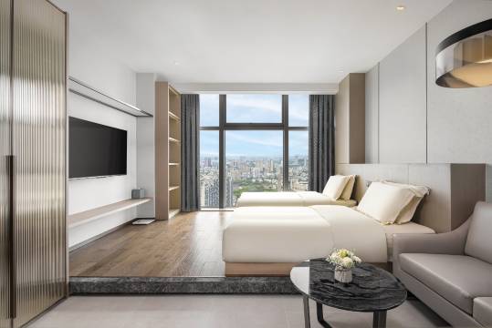 前台和早餐厅在42楼,视野很好,早餐种类丰富,食材也很新鲜。前台人员态度很亲切,尤其是帮我办入住的小琪。房间内卫生不错,设施也很齐全。有地下停车场,可免费停车。美中不足有三点:一是电视机不是正对着床导致看电视不是很舒适,遥控器除了能控制电视开关,无法调节音量;二是房间门底部缝隙很大,夜里走廊灯光很亮,光线从门缝透进来会影响睡眠;三是窗帘遮光性不是很完美。