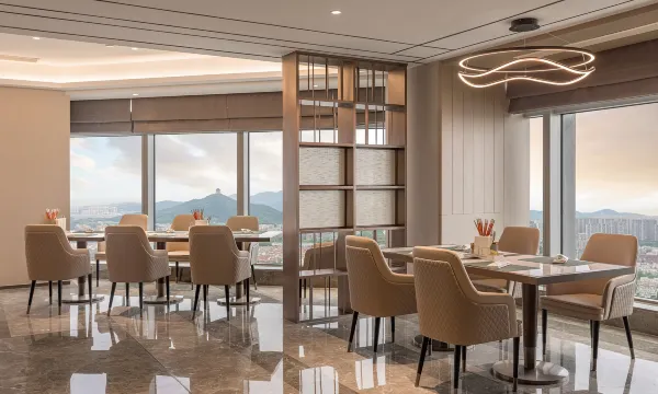 房间宽敞整洁,设施齐全,落地全景玻璃窗,33楼视野广阔,窗外景色一览无遗,甚至能看到太湖喜来登酒店,登记入住时工作人员考虑到我们年纪偏大,预订的房间有台阶,晚上行动不安全,给免费升级了亲子房,非常贴心。酒店地下停车方便。早餐品种十分丰富,新鲜卫生可口,是来湖州两天吃的最舒心的一顿。登记时送新鲜水果,退房时还有伴手礼,湖州特产湖笔一支,感觉甚好。前台服务人员佳佳态度亲切和蔼周到,办好退房手续电梯刚到楼下就接到她的电话,问我是不是水杯忘拿了,真是及时。总之,酒店留给我们的印象非常好,如果再来湖州住宿一定是不二之选,也值得推荐。