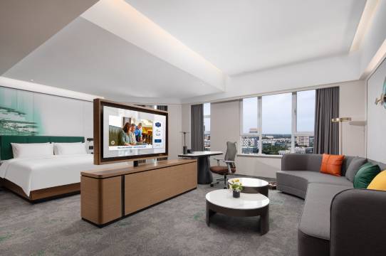 这次入住体验超棒!酒店位置便利,大堂设计简约大气,灯光柔和让人很放松。房间宽敞明亮,采光极佳,窗外就是绿植景观,视野开阔。设施很新,床垫软硬适中,睡得格外香;洗漱台干湿分离超实用。全屋智能控制系统能语音调灯光、空调,科技感拉满。走廊安静无噪音,公共区域卫生到位,电梯响应快不拥挤。整体环境干净雅致,细节处见用心,下次来还选这里!