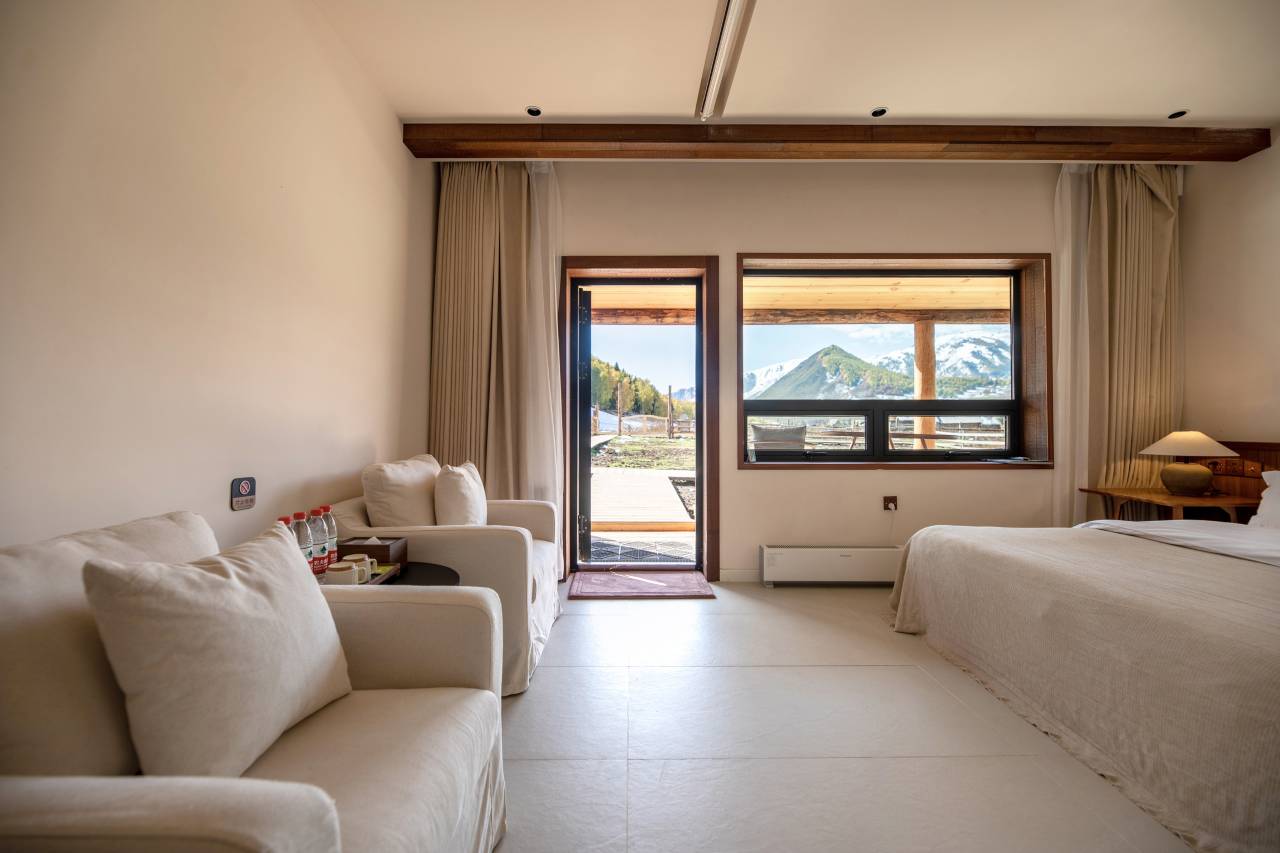 民宿位置在坡上,比较静谧,民宿后面就是白桦林,房间干净卫生,门卫有桌椅可以闲坐喝着茶看远处雪山草甸,店员小哥哥小姐姐人很好很热情给免费升级了房。推荐
