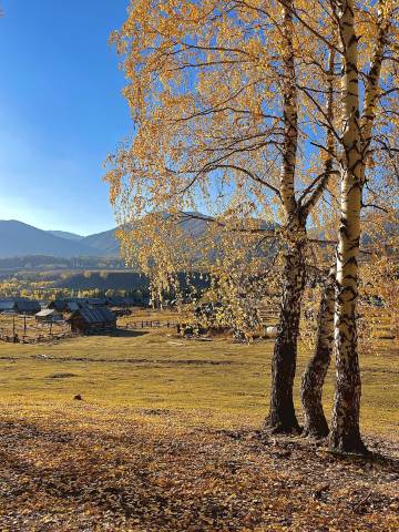 民宿后边就是白桦林,方便拍照📷很安静,晚上和早晨也能看到雾。房间的窗子望过去对面的山⛰️简直就是一副油画🖼️太棒了🌟