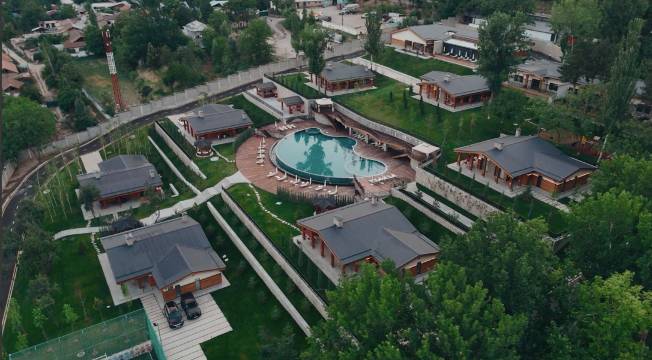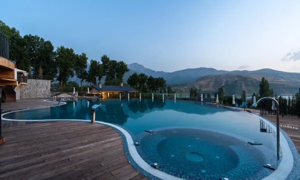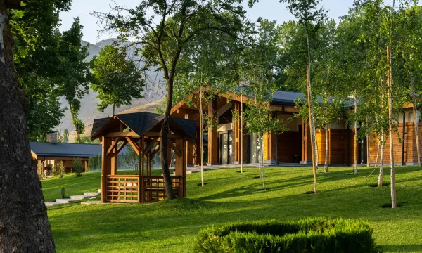 对于两个人来说,这栋小木屋确实有点贵,但如果是一群朋友或一个家庭入住,那就太棒了!床垫很舒服,厨房很大,客厅温馨舒适还有壁炉。外面有 Kazan 锅(一种烹饪工具)、凉亭、秋千和修剪整齐的绿草坪。房间里有浴袍、毛毯和拖鞋。厨房里有大冰箱、电水壶和茶叶。不过,餐具几乎没有。但我们打电话给餐厅后,他们很快就送来了酒杯、餐具和做沙拉的碗。餐厅不提供酒水,也不允许在酒店区域内饮酒,但在小木屋里可以。餐食也送得很快。菜肴有点花哨,味道可以接受,但没有惊艳的感觉。早餐非常棒,无论是环境、窗外景色、食物品质还是服务都很好。总的来说,服务非常出色。工作人员非常友好且乐于助人。天热的时候,可以在漂亮的室外泳池游泳。不过,水有点太冷了。我们没来得及去水疗中心。看照片感觉还不错。酒店区域不大,但打理得很好。可以远眺群山和查瓦克水库,但没有直接通往水库的出口,而且四月底的时候水库里几乎没水了。总的来说,我们非常喜欢这里。在这片古老的村庄和尘土飞扬的道路中,这里真是一片宁静的绿洲。我们很乐意再次入住。