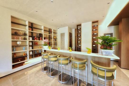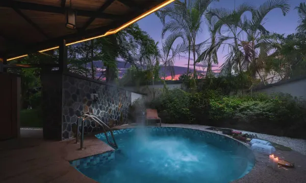 a别墅区里有无边泳池是加分项。清澈见底的池水让人忍不住想要畅游一番。干净的温泉泡池,周围有躺椅和遮阳伞