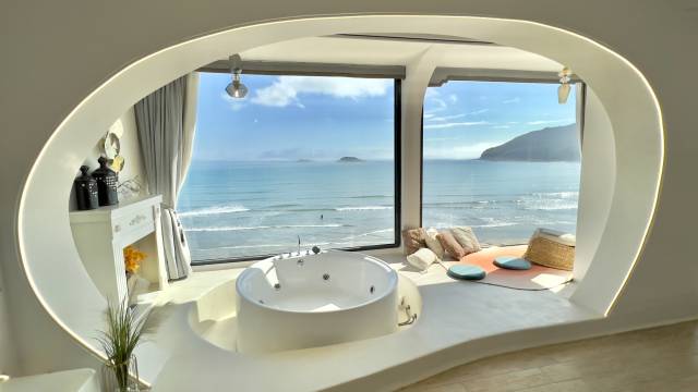 客栈地处双月湾景区东山海,看日出。共两栋楼,客房风格各异,每间房全部大落地窗,间间看海,每间客房卫生间淋浴干湿分区,除标准间外的每个客房均配有观海浴缸。躺在浴缸和躺在床上都可观看日出。