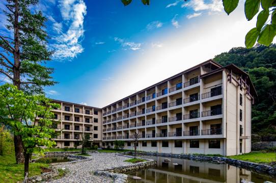 酒店坐落于神农架国家公园大九湖湿地公园景区旁,四周风景如画,建筑依山就势,群落布置,拥有接待中心、客房、展示厅、餐饮中心、会议厅、购物娱乐中心、康养服务中心等各种服务空间和设施。建筑群背靠华中屋脊-神农顶,掩没于原始森林之中,群山环绕、绿树蔽日、门前碧水流淌,自然环境极佳,内部配置高端,大气,使客人在享受高档硬件条件的同时充分感受原始自然的环境景观。