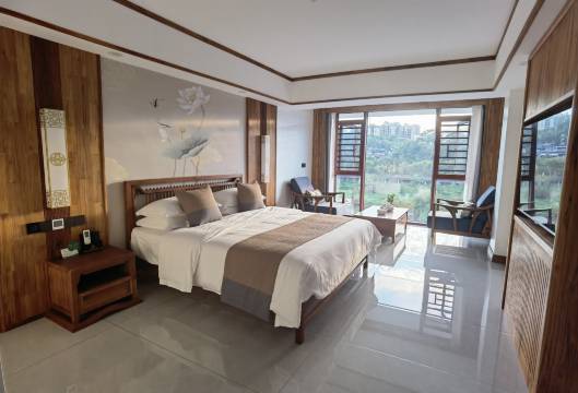 房间非常不错全是实木 房间空间也很大 老板开劳斯莱斯接送 上车直接一根100一包的大重九 我靠吓我一跳 早餐也很多样话房间非常干净整洁666 环境也是超级好晚上睡觉很安静!!!