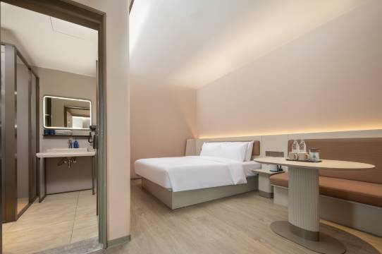 好像是23年装修,自然很新很干净。房间很大,在我住过的汉庭里算是大的了。大堂装修简洁,但面积过大,显得有些偷工减料的粗糙感。特别表扬这里的早餐,很不错。