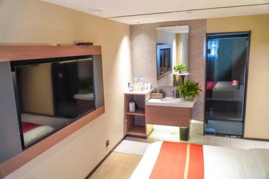酒店门口可以停车,店堂电梯楼道干净,床上用品睡觉舒服,隔音好睡觉安静,马桶干净无痕,就是浴室花洒出水细小冷热不均,应该更换