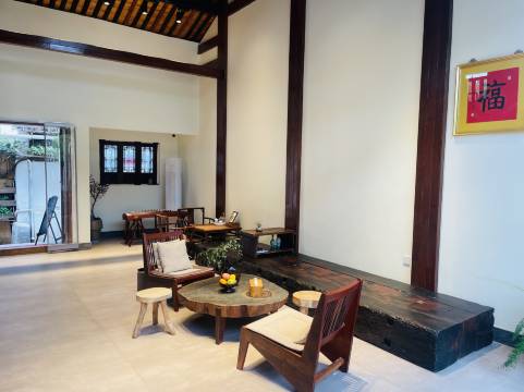 静庐中式美宿位于书圣故里,题扇桥畔。很高兴能与天南海北的朋友们相聚在静庐。静庐所在的书圣故里,位于绍兴主城区的中心位置。书圣故里景区十分钟内步行皆可到达。离鲁迅故里,沈园较近。途经八字桥,广宁桥。离阳明故里,仓桥直街较近。静庐共有多间房(两个四合院组成)其中家庭房2间,榻榻米房一间,其余均为花园大床房。静庐配有茶室,会议室,两个花园以及宽敞明亮的大厅,可品茶品酒,与亲朋故友相聚在静庐!