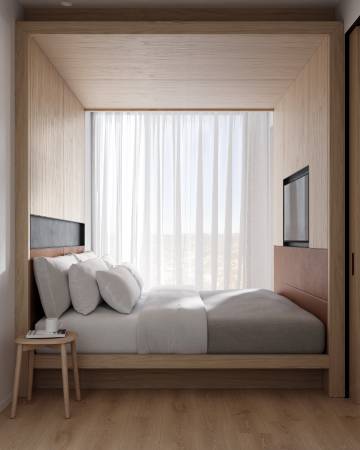 房间虽然紧凑,但空间利用得很好。床的布局可能会让人爱憎分明(译者注:即有人喜欢有人不喜欢)。