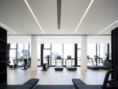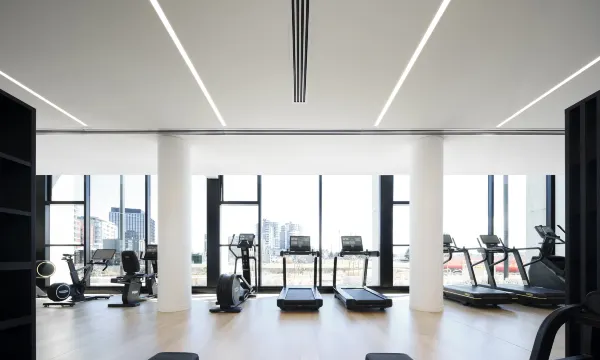 酒店很新,有很棒的休息区和共享办公空间。健身房是我见过设备最齐全的,有各种有氧器械、力量训练器械和自由重量器械。