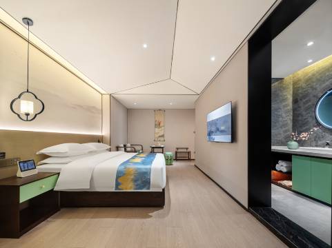 产品:酒店床品是Amian品牌,洗漱用品是自主品牌,新中式家具,房内用品,丰富的房型满足您的不同入住需求