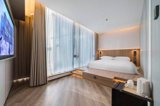 酒店整体设计装饰风格现代简约,但不失精致。观景山水、舒适敞亮的客房,让着眼慢生活的宾客可以远离喧嚣,静享私密,体验到“富春山居图”中自由无拘的生活意境。酒店内健身房、游泳池、停车场等设施一应俱全。
