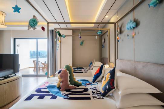 酒店外观设计酷似邮轮造型,走进大堂就被惊艳到啦我们一家四口订的是双宝亲子房,前台工作人员很热情的接待我们办理完入住还贴心的指引我们到电梯口,房间设施齐全小朋友很喜欢,贴心的准备了小朋友所需要的各种洗漱用品,房间自带阳台可以看到很美的海景,第二天的早餐也很丰富!!
