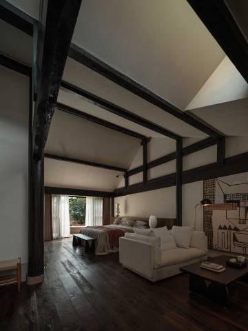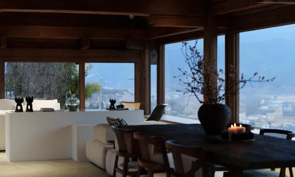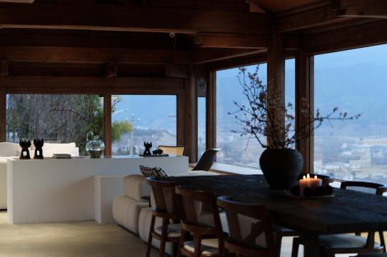 具有浓郁白族民居风情的黄色夯土墙,与现代艺术雕塑在充足肆意的阳光下,显现一种安静和力量;传统的木结构民居结合浪漫的法式门窗在怀旧与优雅中产生新的韵味;中古家俬与白色室内空间的撞色搭配,于纯静中带有一丝暖意。