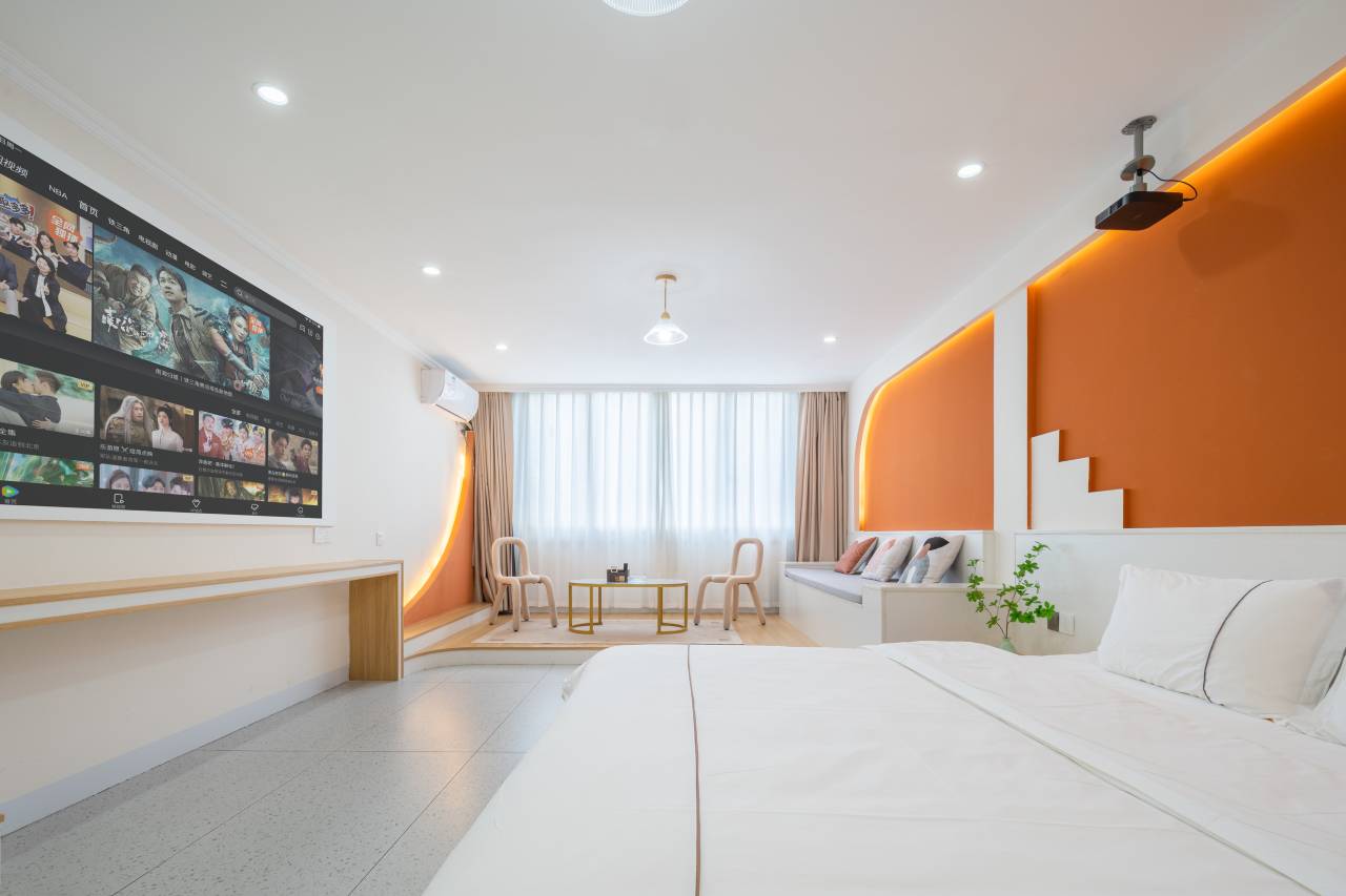 房间里的投影太加分了,晚上窝在被窝里看剧氛围感拉满!还有那个波浪形的试衣镜,简直太爱了。房间还有专属女孩子的化妆镜。床品柔软舒适,睡了一夜都特别安稳,完全没有噪音打扰。
