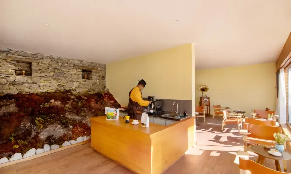 第二天我是要去隔壁海子高原徒步的,爸妈就一直就在酒店里面休息,据他们说这里含氧量合适而且空气很清新。老板娘也招呼他们在阳光房里面,茶叶核桃李子咖啡随便吃喝。因为餐食也挺好的,两天在他们家吃了四顿。