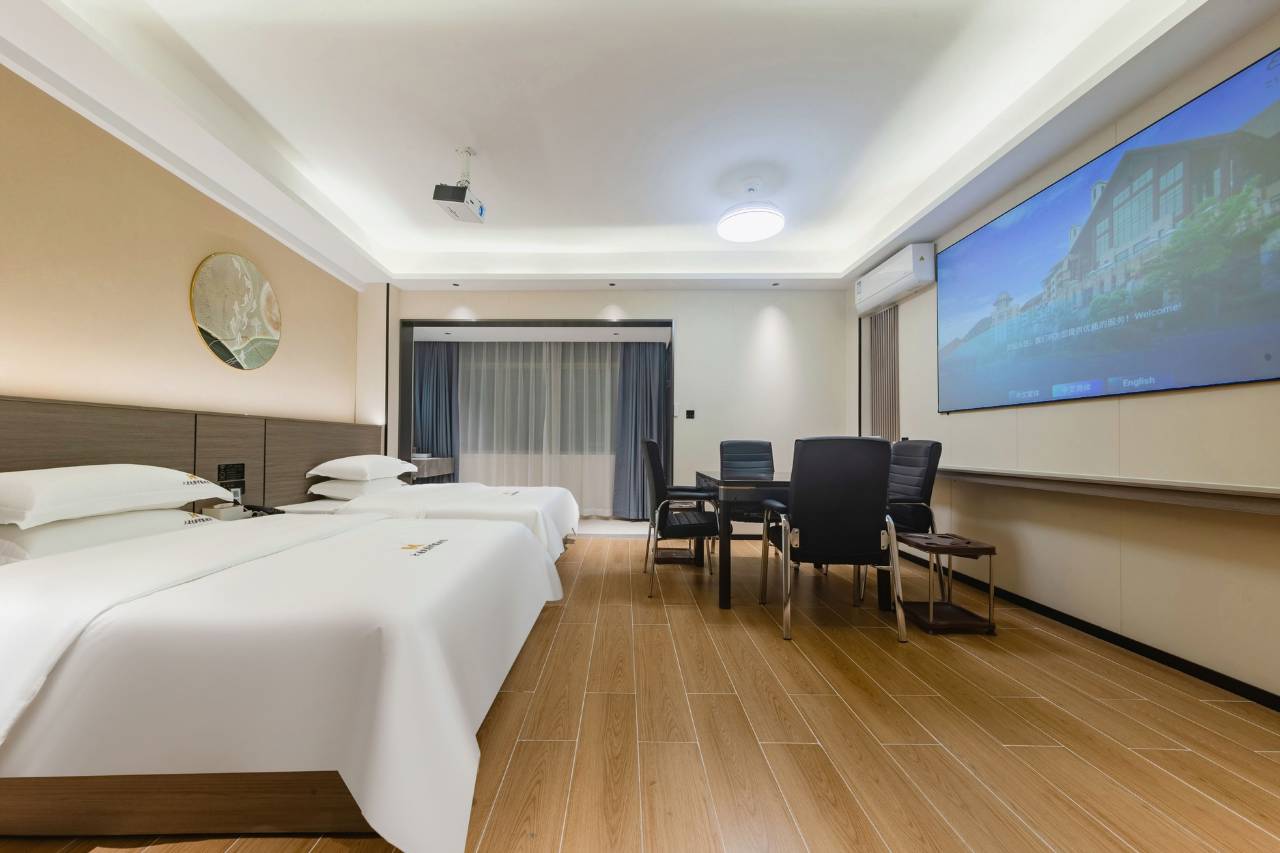 酒店走廊和大堂都很简约大方 高级感up,服务态度温暖。床品都很干净舒适 床垫和枕头都超软!睡着超舒服。卫生间也特别干净整洁,配备齐全。投影清晰,可以直接躺着看电影简直不要太爽!酒店距离万达广场也很近,购物方便。推荐哦