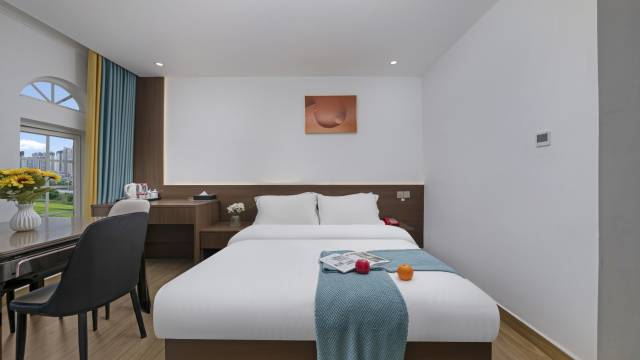 老板非常的好,免费给我们升级房间,房间非常宽敞整洁住着非常舒适,床单被套也干净,独立卫生间,没有异味,每天也有打扫卫生的阿姨询问需不需要打扫卫生。服务态度很好。