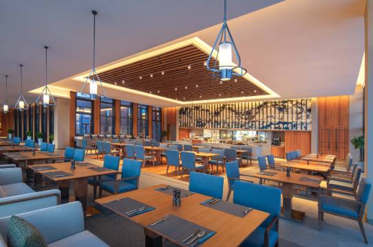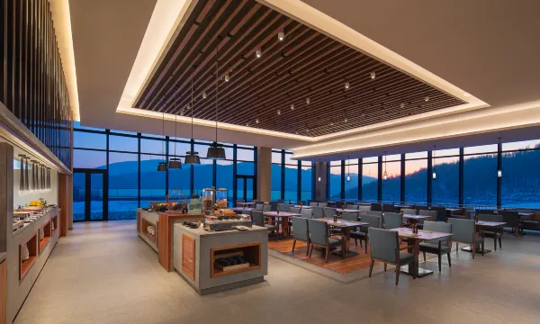 餐厅空间布置舒适,有个室外平台冰墩墩雪融融很可爱,早餐和正餐味道都不错。