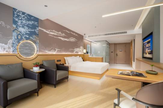 智能设施:客房配备小度语音控制系统(灯光/窗帘/空调)、智能马桶及干湿分离卫生间,布局合理洁净;1.3米大床宽敞舒适,适合家庭与商旅。