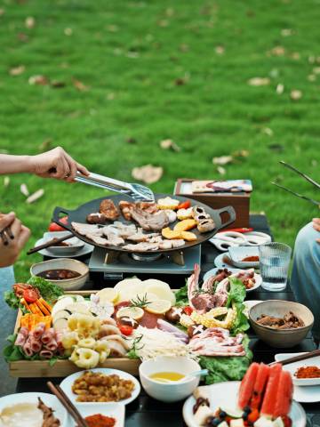 ▫️ 晚餐烧烤:暮色里摆开长桌,鲜切肉、蔬果堆成小山,冰啤酒碰杯时,晚风都带着烟火气。