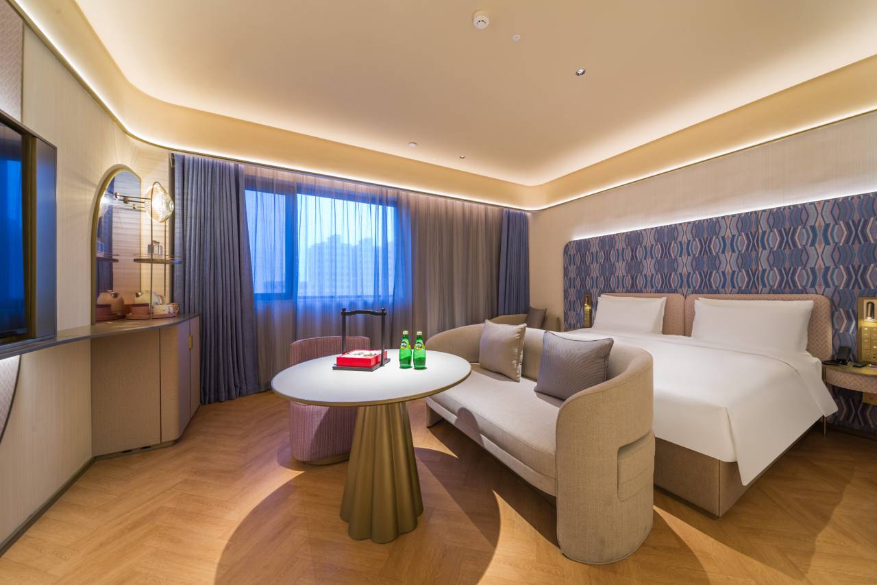 房间是轻奢风,我最爱那张乳胶床垫,软硬度刚好,出差连熬两晚写方案,躺上去像陷进云里,第二天脖子都不酸。浴室配的戴森吹风机+欧舒丹洗护,连浴盐都是玫瑰味的,泡澡时看窗外的梧桐树影,压力全消。最惊喜的是迷你吧,居然有现切的当季水果和手作曲奇,比某些高星酒店还实在~