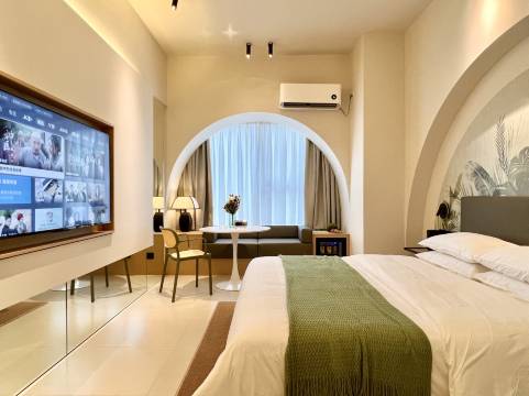 装修很新,有洗衣机、大电视,还有小爱语音音箱,还有浴袍,非常nice。酒店楼下就有很多吃的非常方便,窗边还能看到海。卫生也非常干净。