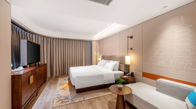 酒店客房设施:液晶智能电视、中央空调、电动窗帘、马桶、WIFI、洗手台、行李架、青花瓷茶具、多种规格电源插座、110V电压插座、书桌、衣柜、220V电压插座、开夜床、针线包、鸭绒被、备用床具、24小时热水、拖鞋、浴室放大镜、独立沐浴间、浴衣、吹风机、一次性洗漱用品、电话、有线频道、智能门锁、电热水壶、瓶装矿泉水