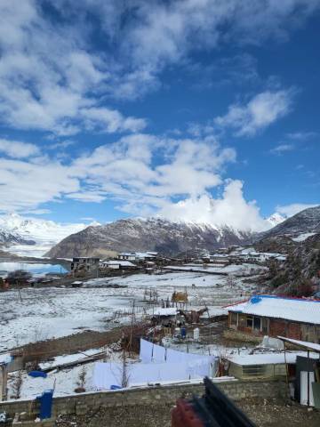 民宿老板和老板娘人很好 老板娘煮的面条也好吃 民宿不错 在这个资源稀缺的地方 有个落脚地 有饭吃 已经很不错了 建议来玩的朋友们 怕冷的 不要洗澡 容易高反 带多一点暖宝宝和氧气罐还有头疼药 民宿房间窗户就能看到雪山 总体来说不错 图片是民宿门口的风景