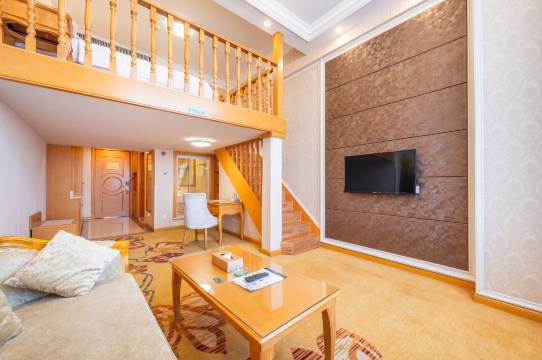 酒店客房面积达55平方,上下两层复式,将会客和睡眠区域分开,让会客、办公、休闲空间更加从容;提供百兆宽带极速上网、50个卫视频道、24小时热水等各类设施。