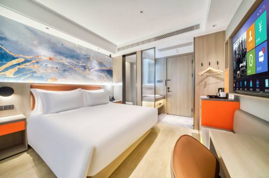 房间整体布局很不错 ,小温馨布局,房间干净卫生,床睡起来很软,很舒服。其次是房间设施挺新的,应该是新酒店吧。最主要还是前台小姐姐服务很热情,主动询问我们需要什么类型房间,免费给我们升级带投影的房间,非常客气,楼下吃的也方便,一条街都是吃的,停车也是免费的,算是性价比比较高的酒店,非常不错,必须好评